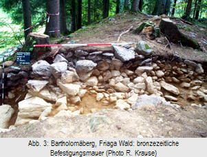 Die Nordflanke des Hügels wurde gegen die Bergseite von einer etwa 80 Meter langen Steinmauer geschützt (Abb. 2-3), deren Versturz heute noch als flacher Wall zu erkennen ist. Die Mauer wurde in Zweischalentechnik trocken gemauert und besitzt auf der Kuppe eine Breite von 3,0 Meter, an der Flanke 2,0 Meter. Die Anbindung der Kulturschichten zeigt, dass sie nach der ersten frühbronzezeitlichen Besiedlungsphase (Abb. 4) am Beginn der mittleren Bronzezeit im 16. Jahrhundert v.Chr. errichtet wurde. Diese massive Befestigungs- oder Burgmauer, die die Siedlung gegen die Bergseite schützte, charakterisiert die Anlage als befestigte, bronzezeitliche Burgsiedlung, die eine der ältesten bronzezeitlichen Burgen in den Alpen darstellt (Abb. 5).